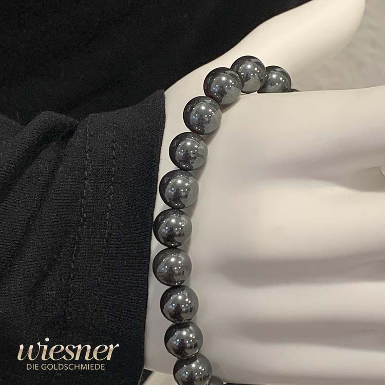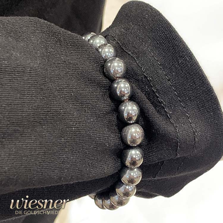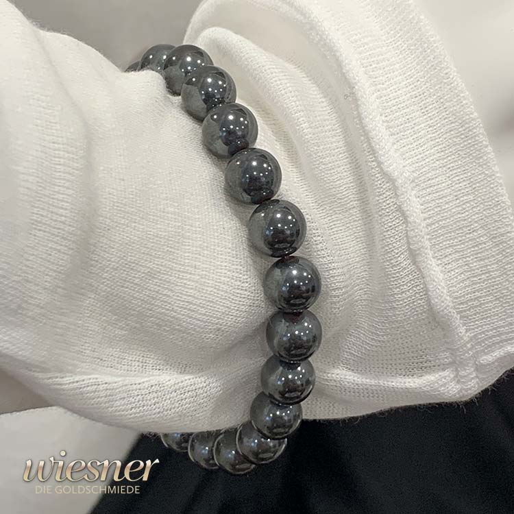 Der intensive, metallische Glanz des Hämatits verleiht dem Armband seinen unverwechselbaren Charakter. In einem kräftigen Anthrazit schimmern die Perlen je nach Lichteinfall von einem tiefen Grau bis hin zu einem fast silbrigen Ton. Dieser Effekt macht das Armband zu einem wahren Blickfang, der auf nahezu jedem Untergrund - sei es Textil oder Haut - beeindruckend zur Geltung kommt.