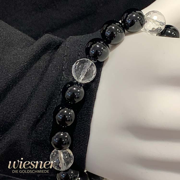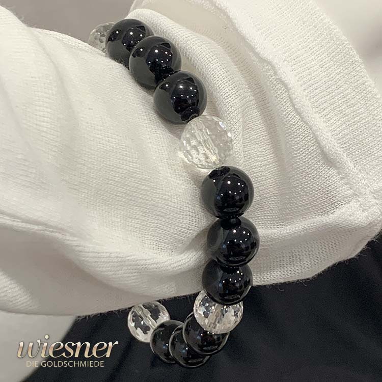 Die dominierenden Onyx-Perlen bestechen durch ihre glatte, spiegelnde Oberfläche, die das Licht einfängt und reflektiert. Sie verleihen dem Armband eine geheimnisvolle Tiefe und Ausstrahlung. In perfektem Kontrast dazu stehen die facettierten Bergkristallkugeln, deren leicht strukturierte Oberfläche das Licht auf faszinierende Weise bricht und dem Schmuckstück einen subtilen, aber unübersehbaren Glanz verleiht.