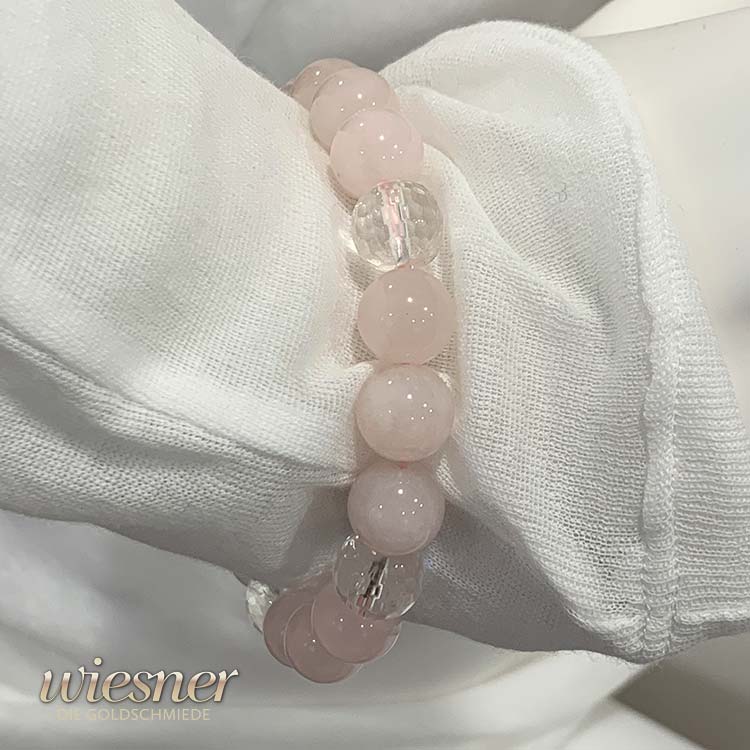 In lieblichem Rosa leuchtet das Rosenquarz Armband dezent an Ihrem Handgelenk. Beihnahe unbemerkt reihen sich die facettierten Bergkristall Kugeln dazwischen.