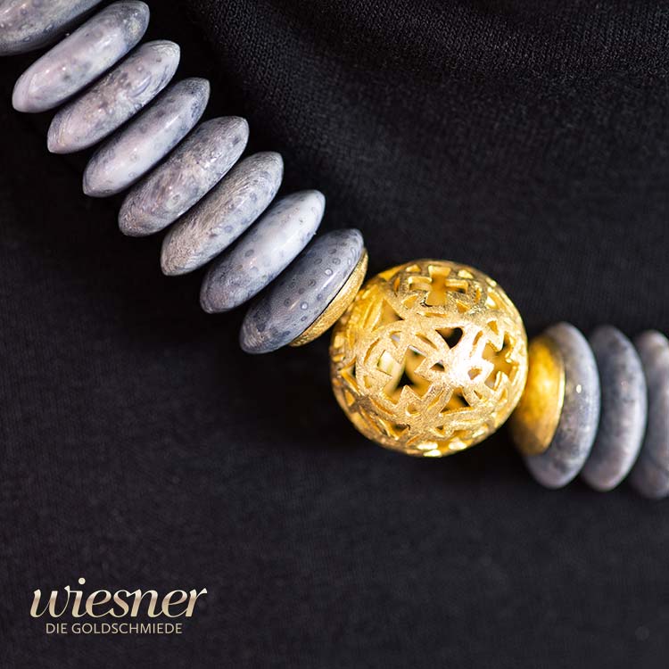 - Akzente: Vergoldetes Silber (Kugel, Zwischenelemente, Verschluss)