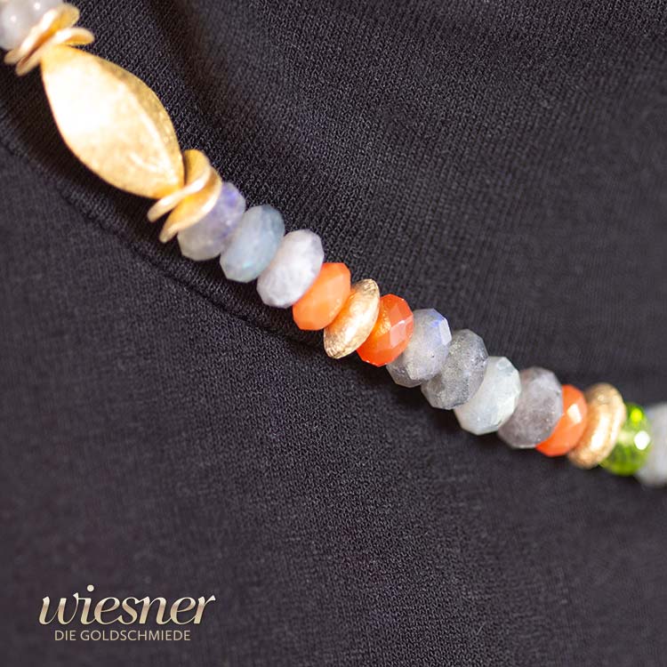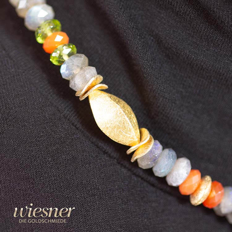 Zwischen den Edelsteinen funkeln silbervergoldete Zwischenteile, die dem Collier einen zusätzlichen Hauch von Luxus verleihen. Das Highlight bildet ein ovales, goldtöniges Mittelteil mit einer gebürsteten, strukturierten Oberfläche. Flankiert von geschwungenen Goldelementen, fängt es das Licht ein und setzt einen brillanten Akzent.