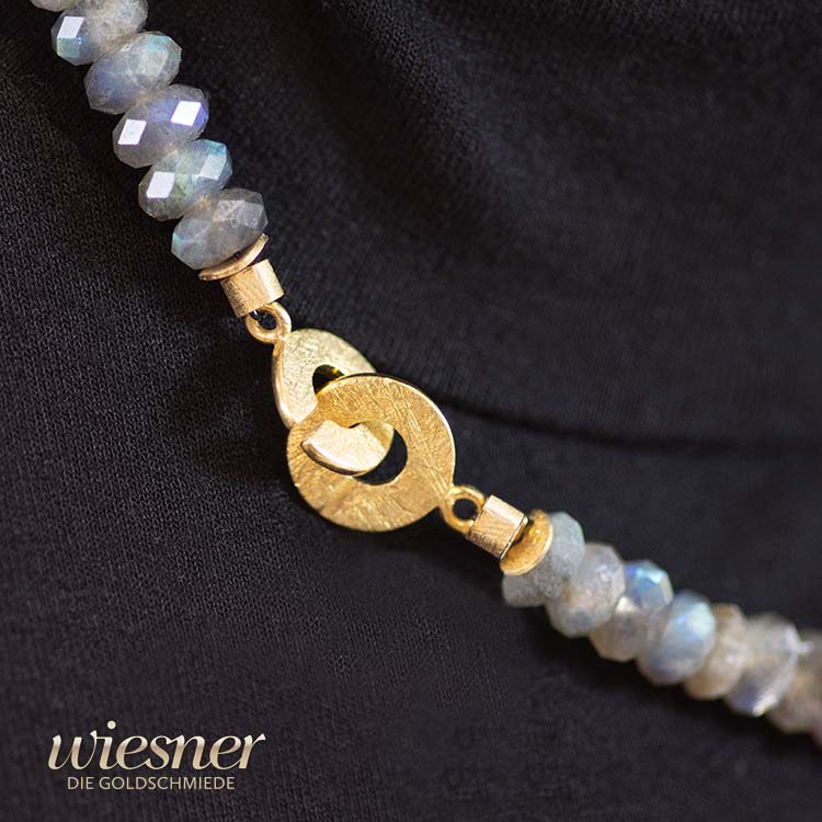 - Labradorit: Mit seinem schillernden Grau-Blau und dem faszinierenden Labradoreszenz-Effekt verleiht er dem Collier eine mystische Tiefe.