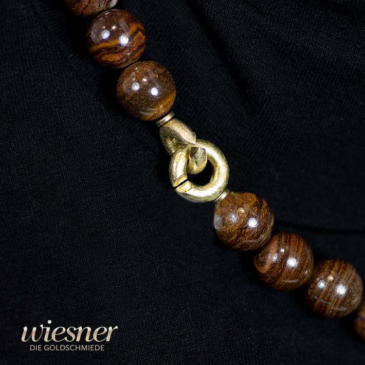 - Opal: Große, polierte braune Kugeln (12-15 mm) mit einem schimmernden, holzähnlichen Muster fangen den Blick.