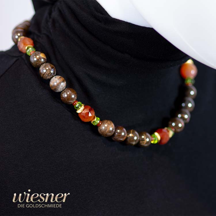 Diese Kette weckt Gefühle von Wärme, Raffinesse und Naturverbundenheit. Die erdigen Töne der braunen Perlen, kombiniert mit dem feurigen Karneol und dem frischen Peridot, schaffen eine ausgewogene und harmonische Ästhetik. Sie verleiht der Trägerin Selbstvertrauen und ein Gefühl der Erdung.