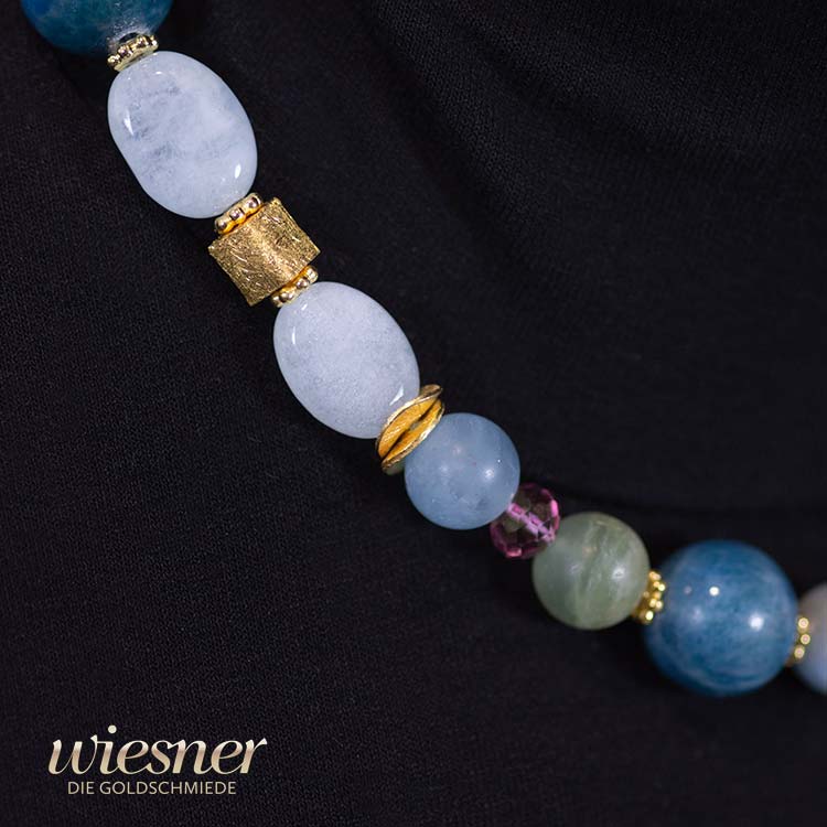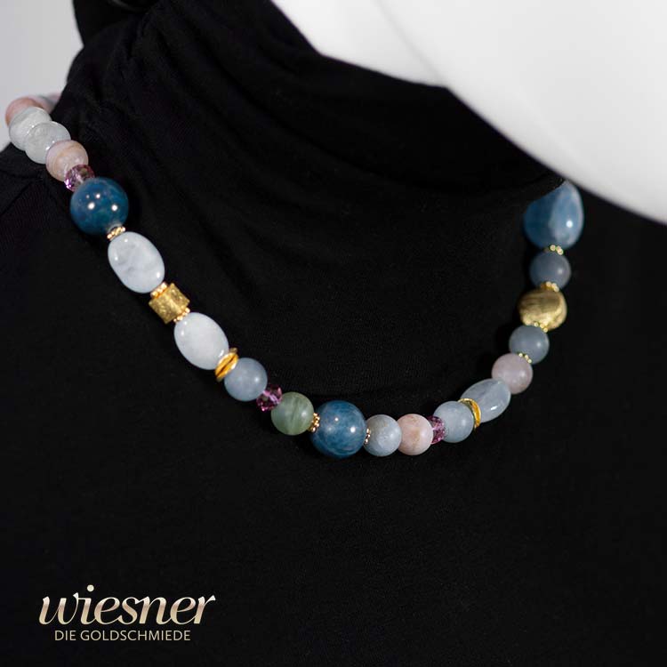 Stellen Sie sich vor, Sie tragen ein Stück des Himmels um Ihren Hals - genau das verkörpert unsere exquisite Edelsteinkette. Diese außergewöhnliche Kreation vereint die zarten Farbtöne von Beryll, Aquamarin, Rosenquarz und Kyanit zu einem Schmuckstück, das sowohl Eleganz als auch Natürlichkeit ausstrahlt.