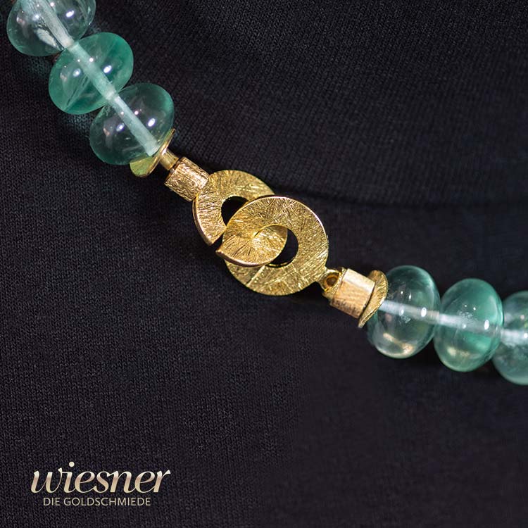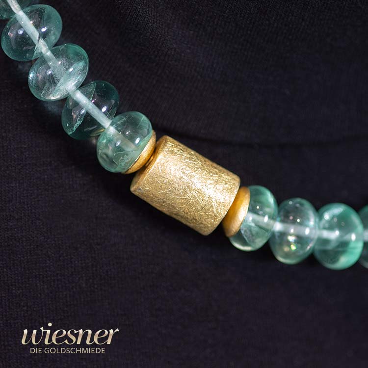 Jedes einzelne dieser Colliers wird in unserer Werkstatt in Deutschland von erfahrenen Goldschmieden handgefertigt. Die sorgfältige Auswahl der Fluorit-Perlen und die präzise Verarbeitung der Goldkomponenten machen jedes Stück zu einem einzigartigen Kunstwerk.